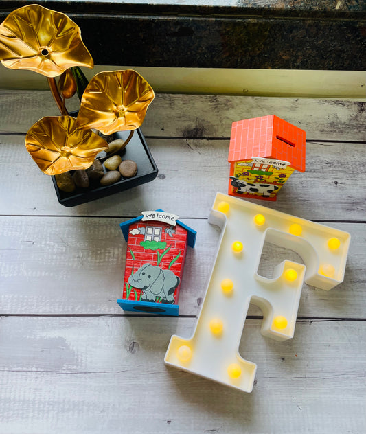 Wooden piggy banks in assorted colours